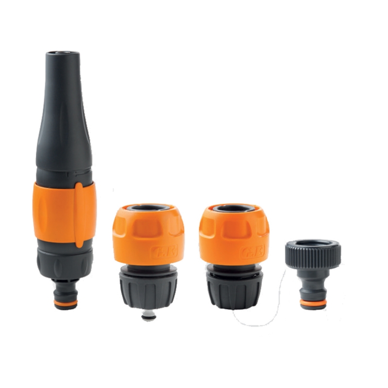 Il kit comprende: lancia a spruzzo media portata, presa rubinetto 3/4”, raccordi portagomma “Aperto” e “Acquastop”.
