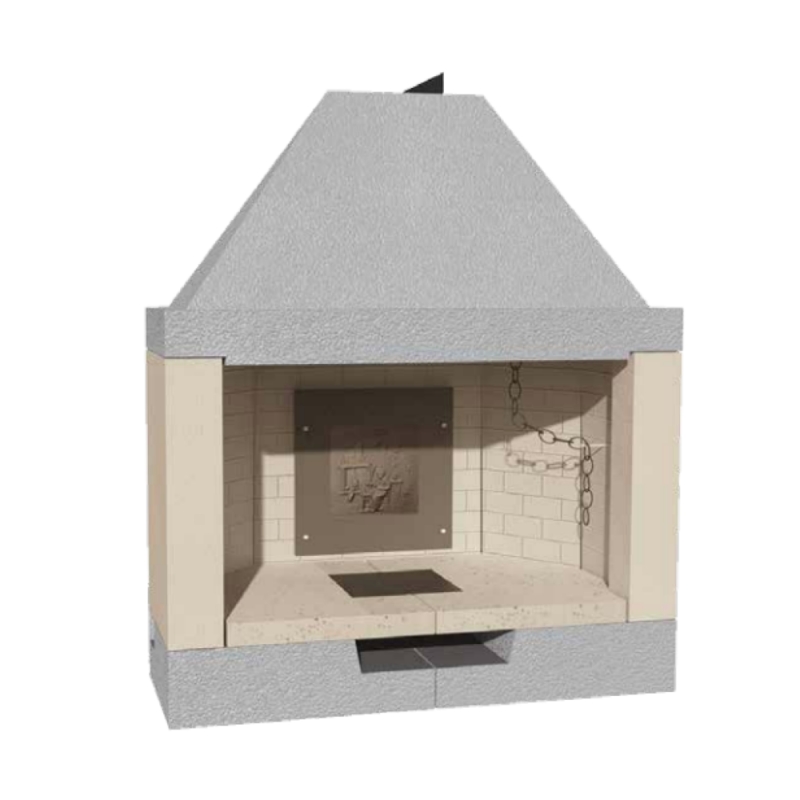 Focolare decorativo o da cottura ad uso ricreativo completo di: parafiamma in ghisa, valvola fumi, vaschetta raccogli cenere e griglia in ghisa.